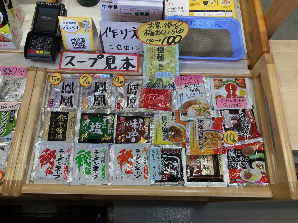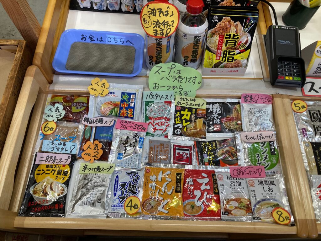 Inside the shop, you’ll find packs of noodles (usually 5 servings each), along with a variety of soup bases like soy sauce, tonkotsu, miso, and cold ramen broth—perfect for crafting your own ramen bowl at home.