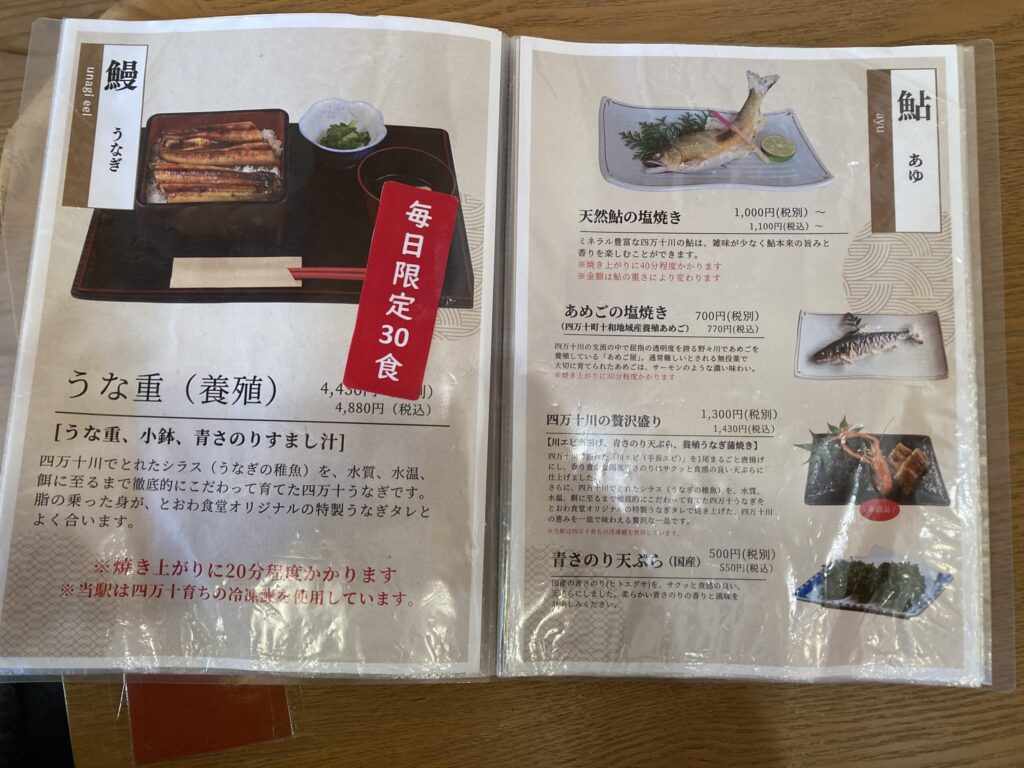 My friend ordered unagi don (30 daily limit) + grilled ayu sweetfish. I chose “Toowa Shiki no Sato Gozen”—seasonal Kochi flavors including ayu, unagi, and Shimanto pork.